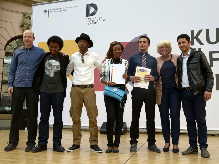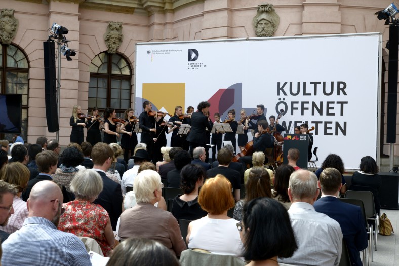 Bei hochsommerlichen Temperaturen fand im Schlüterhof des Deutschen Historischen Museums die Eröffnung der Aktionswoche von „Kultur öffnet Welten“ statt. Höhepunkt der Veranstaltung war die Preisverleihung des Sonderpreises für Projekte zur kulturellen Teilhabe geflüchteter Menschen durch die Kulturstaatsministerin Monika Grütters. Als erste drei Gewinner wurden Banda Internationale (Dresden), Kino Asyl (München) sowie Multaka (Berlin) ausgewählt. Sie erhielten ein Preisgeld von jeweils 10.000 Euro. Die anderen sieben nominierten Projekte erhielten 2.500 Euro.